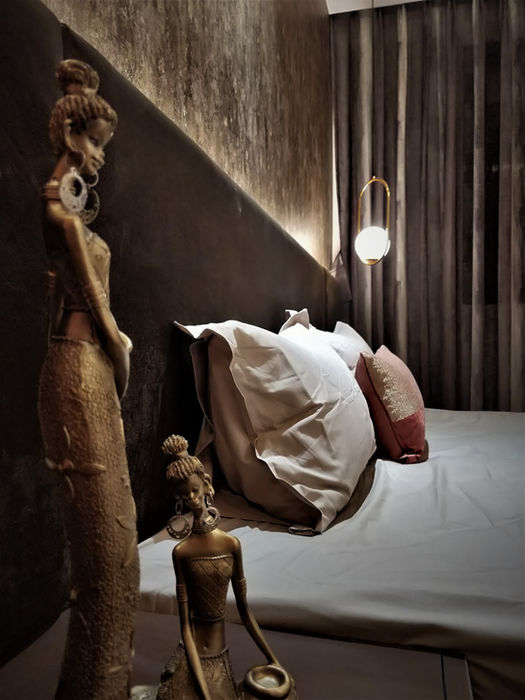 In the bedroom, a wall-to-wall wardrobe designed for maximum functionality features a distinctive brick-toned finish that sets the colour direction for the space. The bed is highlighted by a curved camel-brown upholstered headboard, echoing the use of soft curves introduced across the home. The palette includes soft pink in the living room, subtle lime green in the bedroom, and natural white finishes in the kitchen, bringing warmth and character to this compact residence.